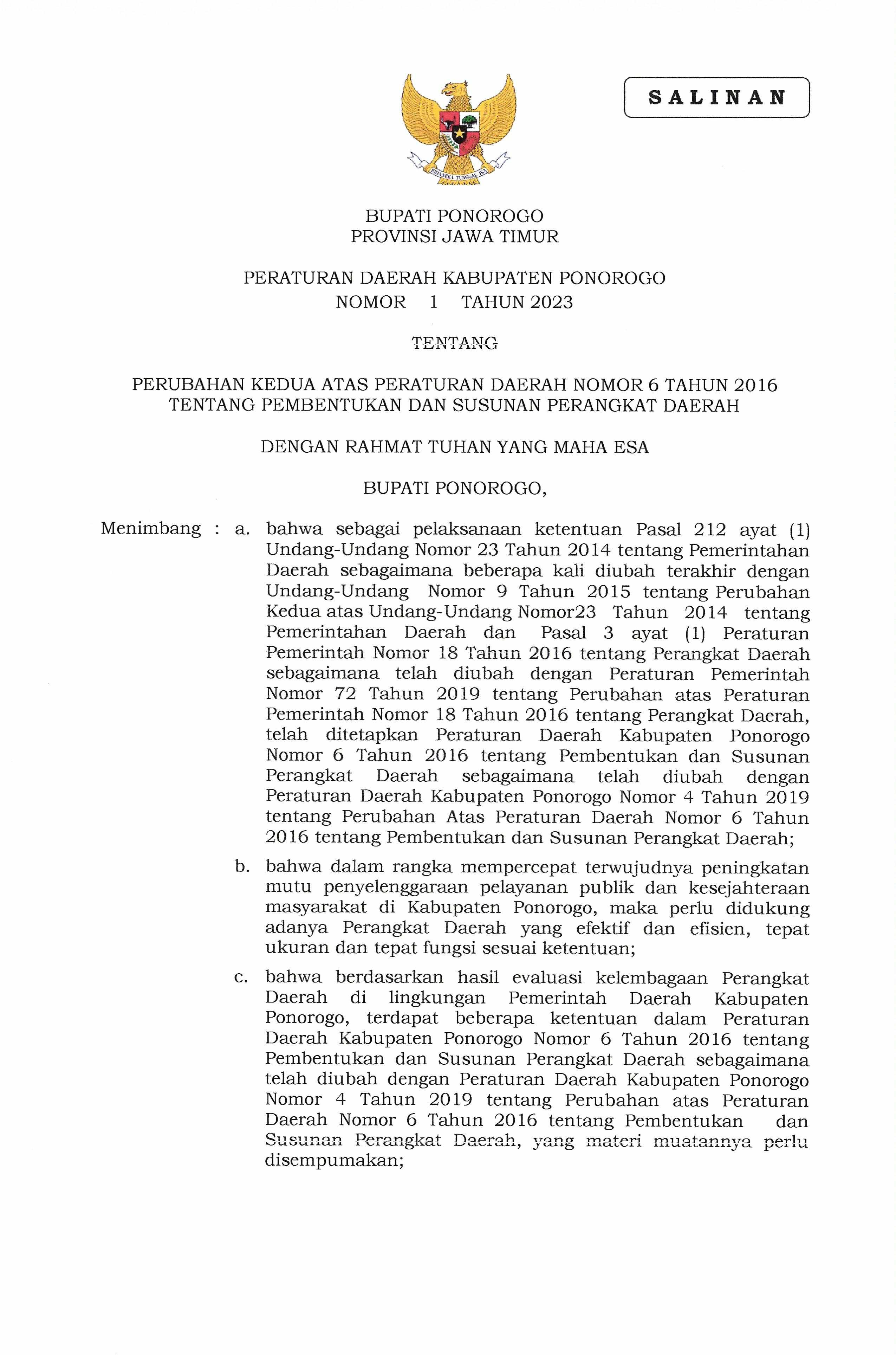 | Judul | Peraturan Daerah Kab.Ponorogo No1 Tahun 2023 ttg Perubahan Kedua atas Peraturan Daerah No 6 Tahun 2016 ttg Pembentukan dan Susunan Perangkat Daerah |