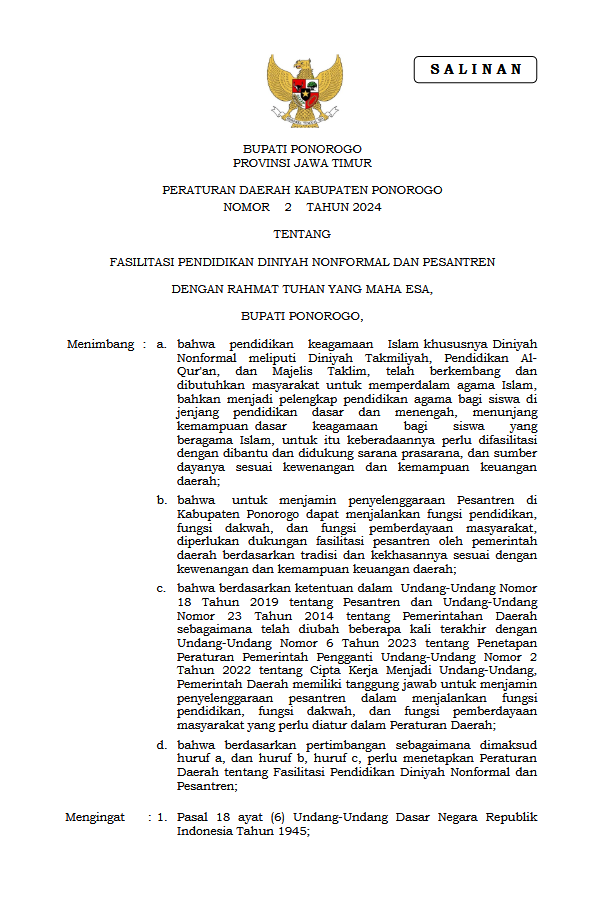 | Judul | Peraturan Daerah Kabupaten Ponorogo Nomor 2 Tahun 2024 tentang Fasilitasi Pendidikan Diniyah Non Formal dan Pesantren |
