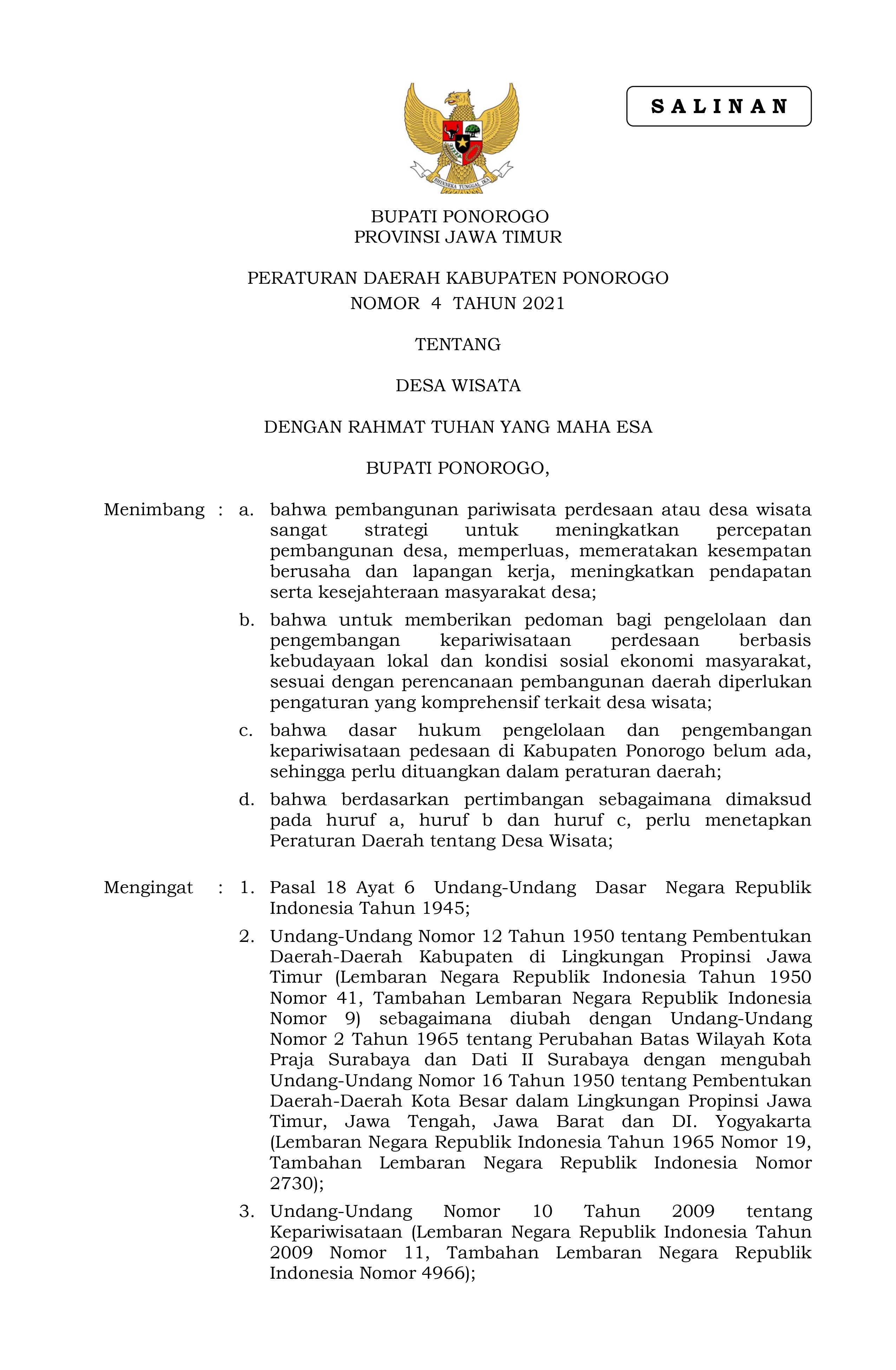 | Judul | Peraturan Daerah Kabupaten Ponorogo Nomor 4 Tahun 2021 tentang Desa Wisata |