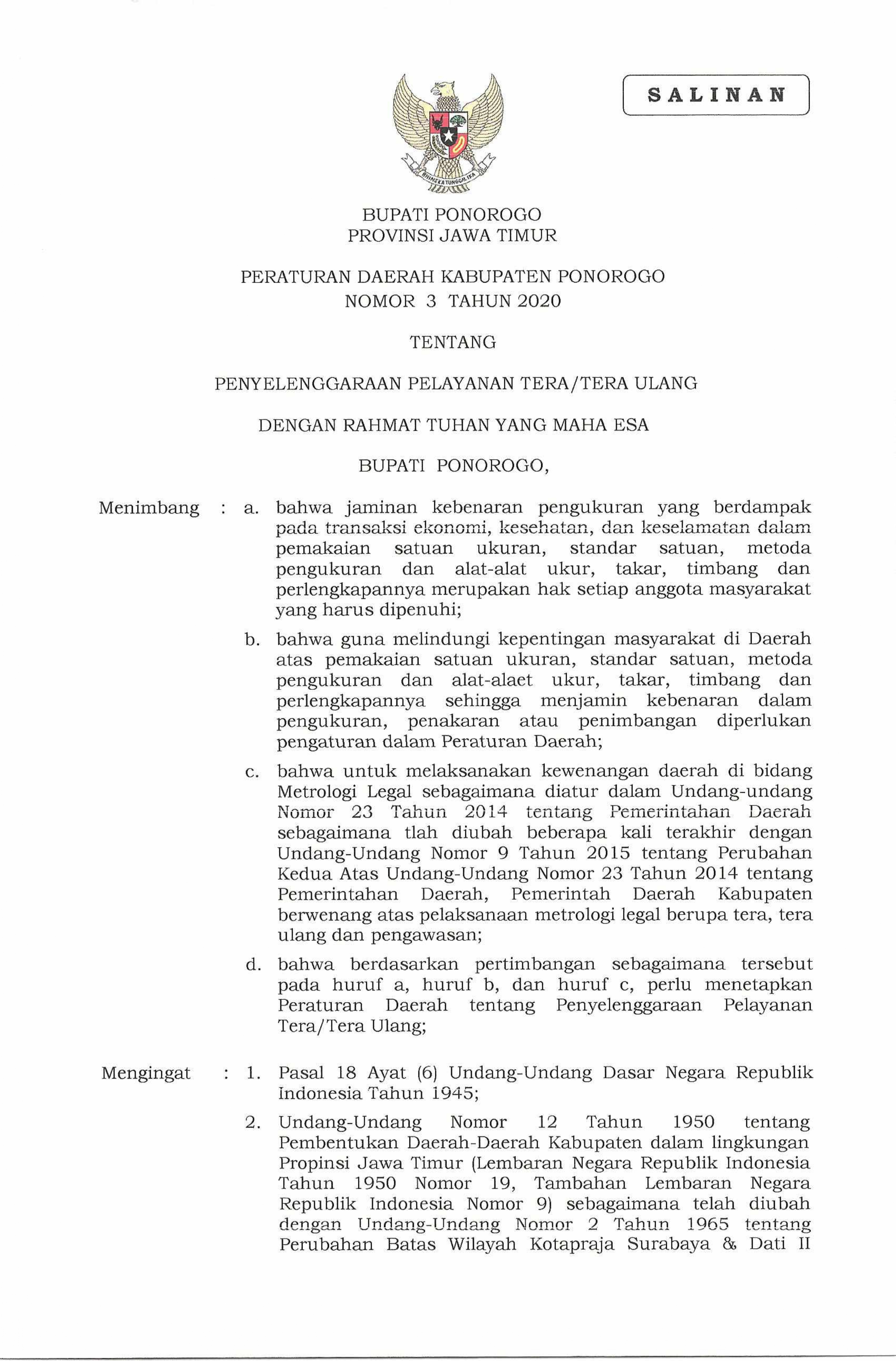 | Judul | Peraturan Daerah Nomor 3 Tahun 2020 Tentang Penyelenggaraan Pelayanan Tera/Tera Ulang |