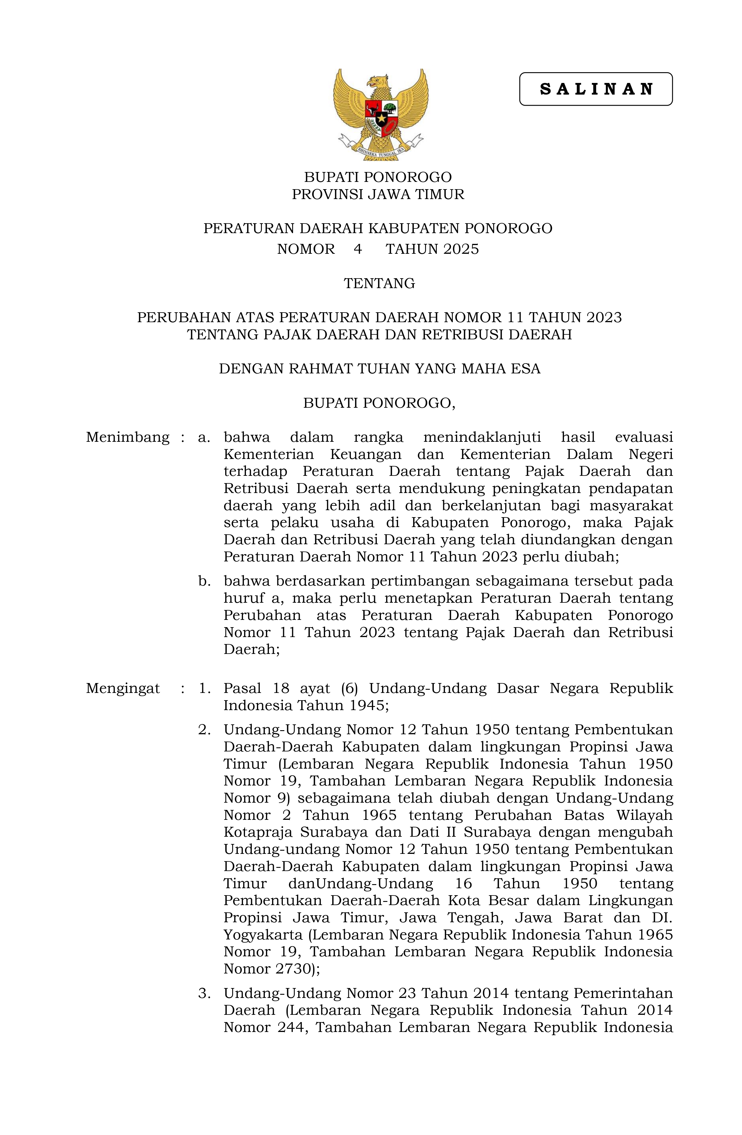 | Judul | Peraturan Daerah Nomor 4 Kabupaten Ponorogo Tentang Perubahan atas Perda Nomor 11 Tahun 2023 Tentang Pajak Daerah dan Retribusi Daerah |