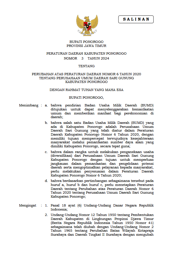 | Judul | Peraturan Daerah Kabupaten Ponorogo Nomor 3 Tahun 2024 Tentang Perubahan Atas Peraturan Daerah Nomor 6 Tahun 2020 Tentang Perusahaan Umum Daerah Sari Gunung Kabupaten Ponorogo |