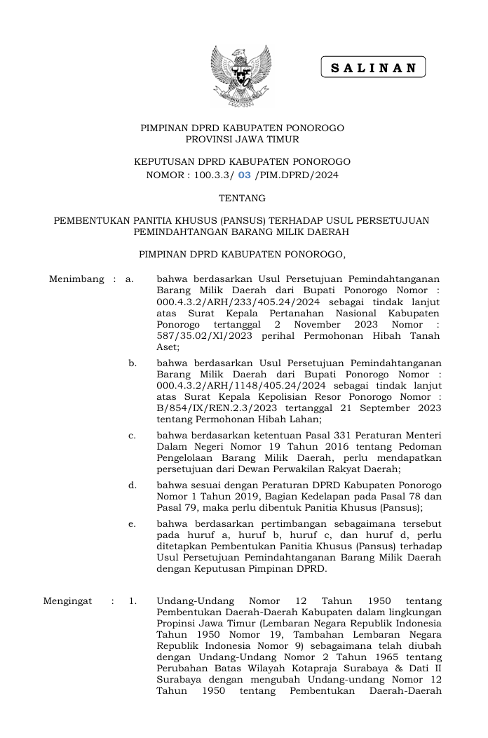 | Judul | Keputusan DPRD Kabupaten Ponorogo Nomor : 100.3.3/ 03 /PIM.DPRD/2024 Tentang Pembentukan Panitia Khusus (Pansus) Terhadap Usul Persetujuan Pemindahtangan Barang Milik Daerah |