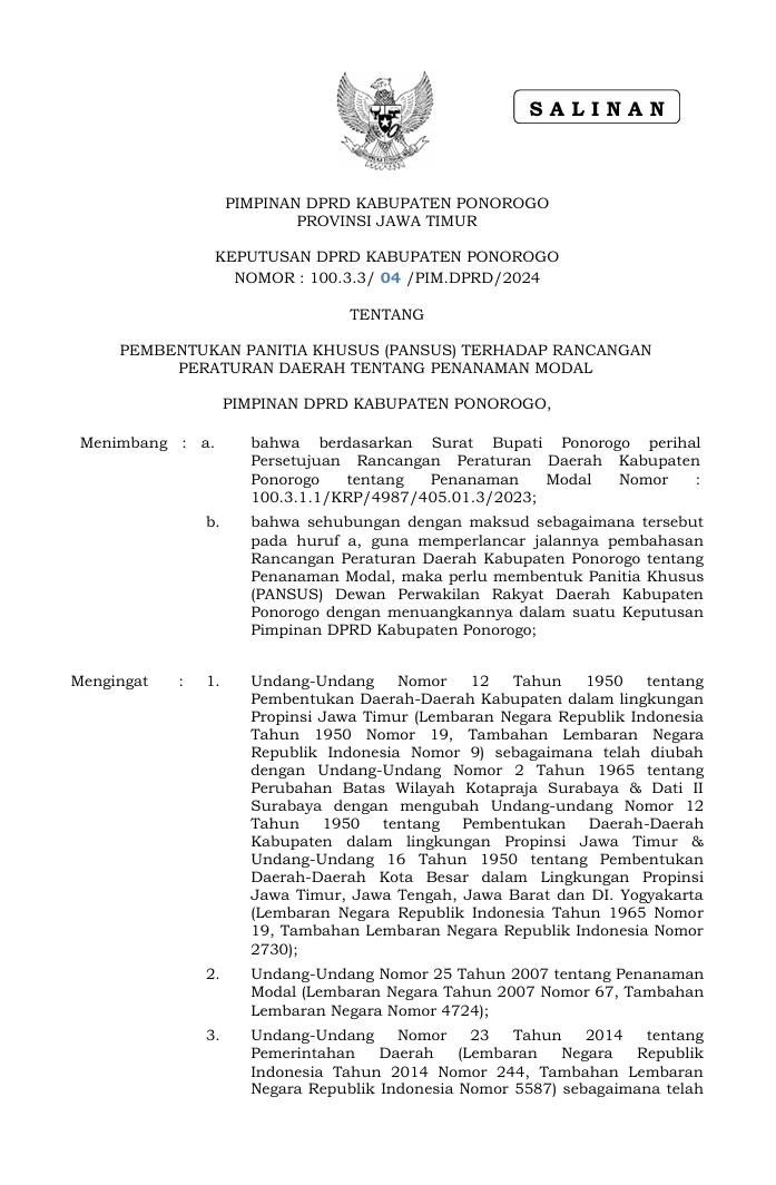 | Judul | Keputusan DPRD Kabupaten Ponorogo Nomor : 100.3.3/ 04 /PIM.DPRD/2024 Tentang Pembentukan Panitia Khusus (PANSUS) Terhadap Rancangan Peraturan Daerah Tentang Penanaman Modal |